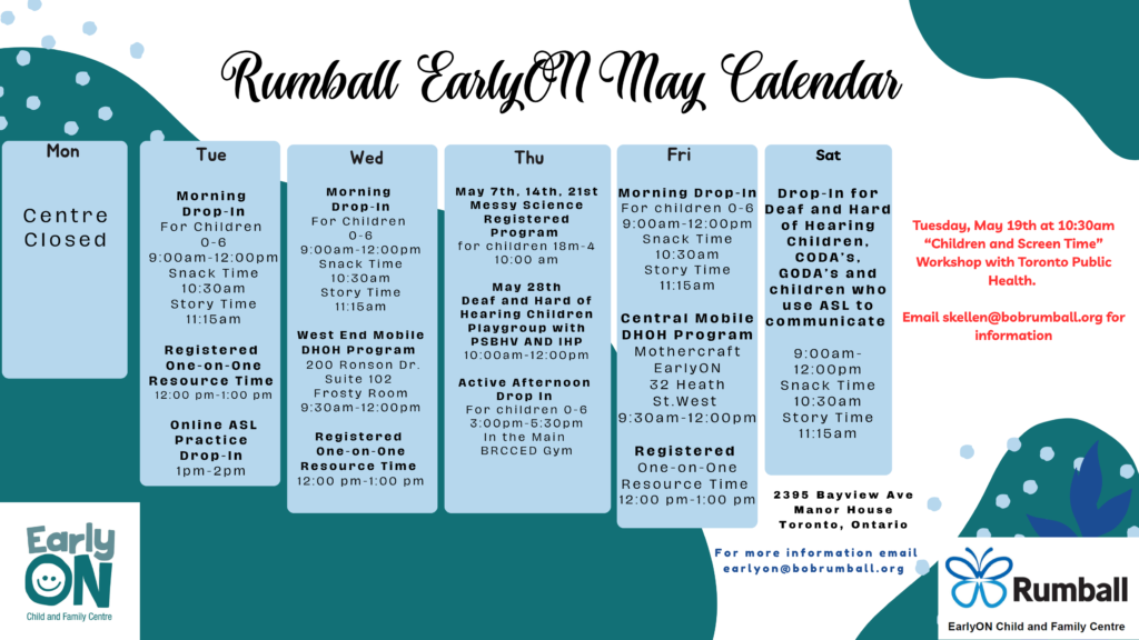 Tuesday, May 19th at 10:30am “Children and Screen Time” Workshop with Toronto Public Health.